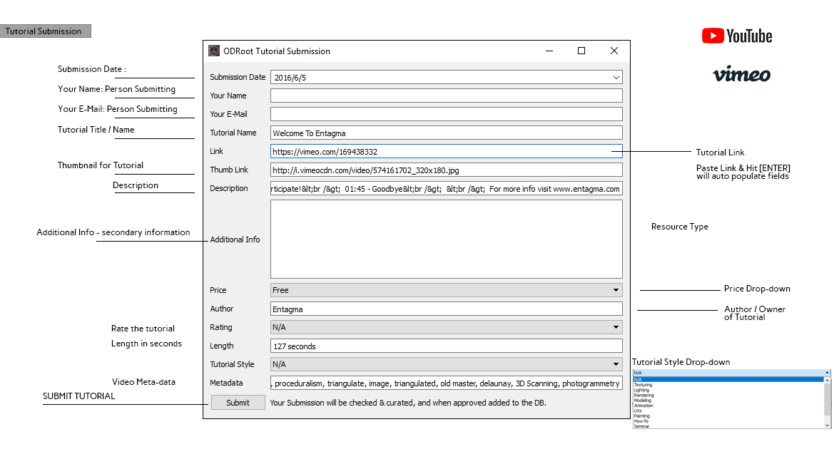 Referencing and submitting tutorials has been made easier by using embed api's: for example if you submit a Youtube video in the link field and hit [Enter] ODRoot will search for the data and fill in the appropriate fields